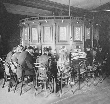 Bild: Besucher im Kaiserpanorama 1913. So konnte man damals Bilder aus Städten in Stereo erleben. 25 Sitzplätze. Arthur Schnitzler war ein großer Fan. Das Bild stammt aus der Ausstellung im Metro-Kino