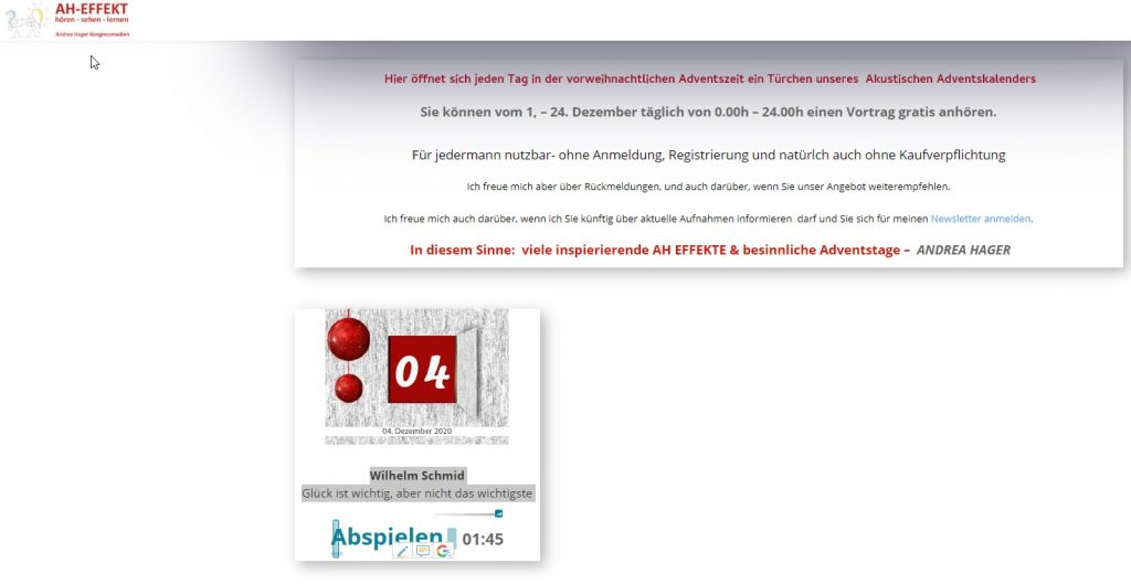 Sie können vom 1, – 24. Dezember täglich von 0.00h – 24.00h einen Vortrag gratis anhören. Die Webseite für jeden Tag.